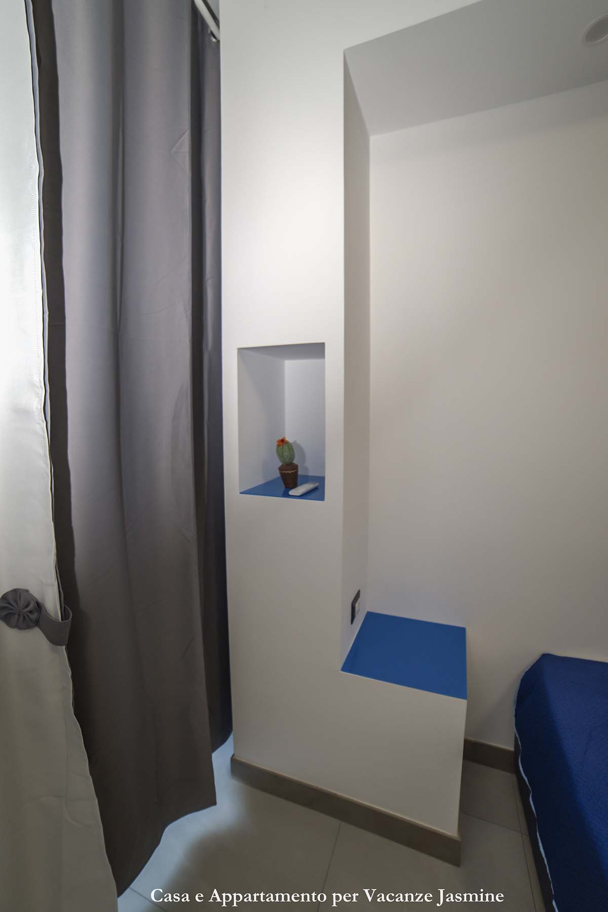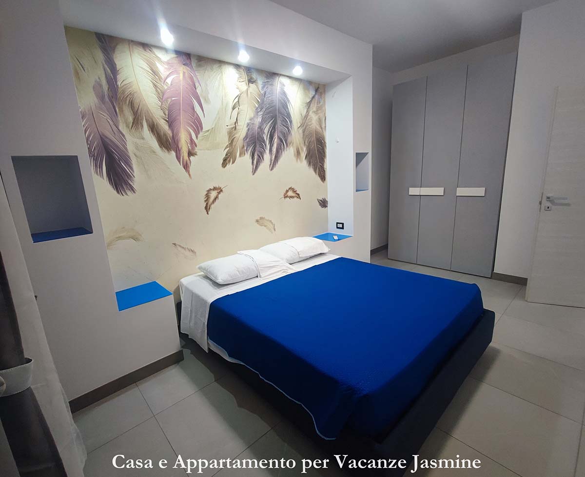 La camera matrimoniale è arredata con un comodo letto matrimoniale, affiancato da due comodini spaziosi in muratura, ideali per appoggiare con facilità le vostre cose. Ogni comodino è dotato di prese elettriche e USB, consentendo di ricaricare comodamente i vostri dispositivi elettronici.