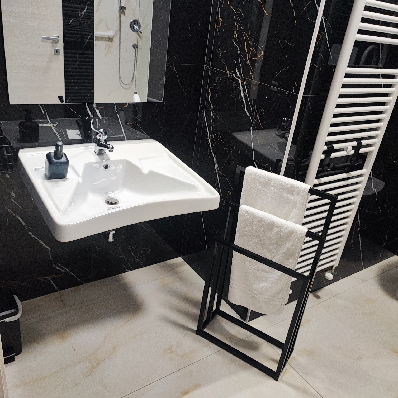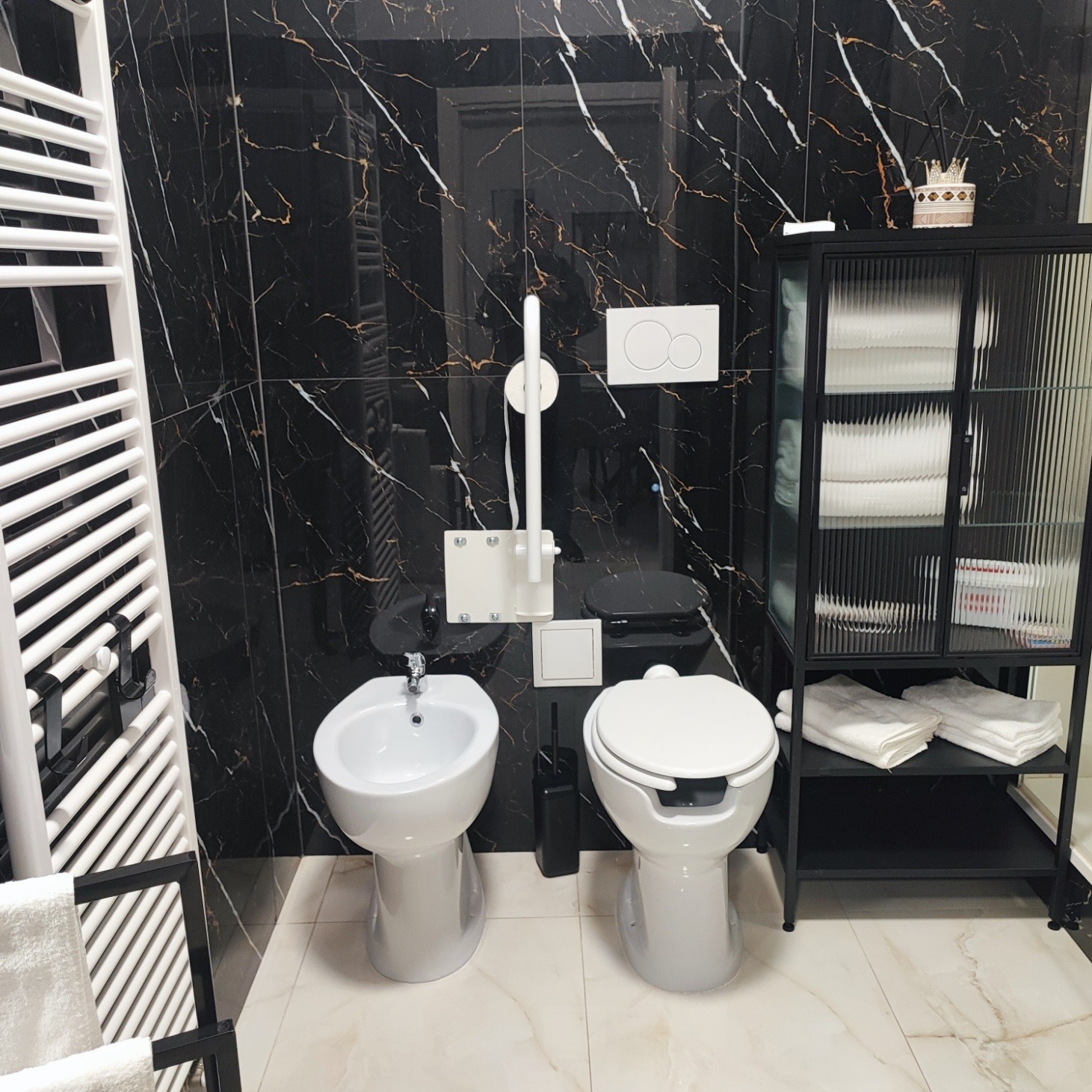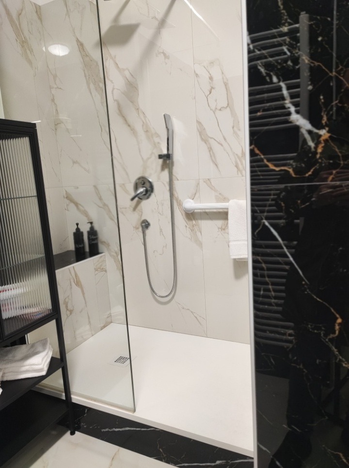 Il bagno è spazioso e accessibile ai disabili, garantendo comfort e praticità. È dotato di wc e lavabo conforme alle esigenze delle persone con disabilità, una doccia con seduta, bidet, termoarredo e asciugacapelli. È inoltre completo di maniglione per disabili, supporto wc con portarotolo, maniglione e seduta doccia.